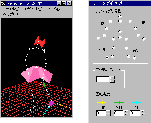 関節の指定が、ラジオボタンを無茶苦茶に使っているし、何よりも回転角度をXYZ軸で何度回転させるかの数値入力っていうのが最低。当然、XYZの順で回転させなきゃ破綻しちゃうし…。